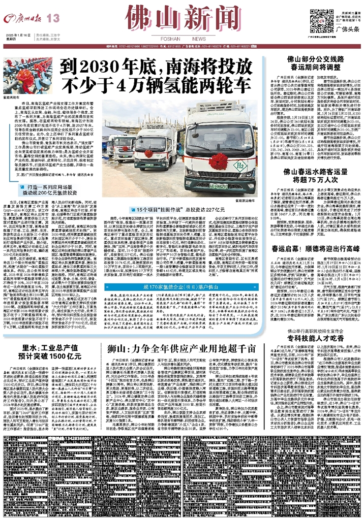 - 佛山部分公交线路春运期间将调整 广州日报讯 (全媒体记者李传智 通讯员杨燕红)昨日,记者从佛山市公共交通管理有限公司获悉,2025年佛山春运已经开启。春运期间,佛山公交将结合佛山西站实际客流以及发车、到站时刻,分时段延长部分公交