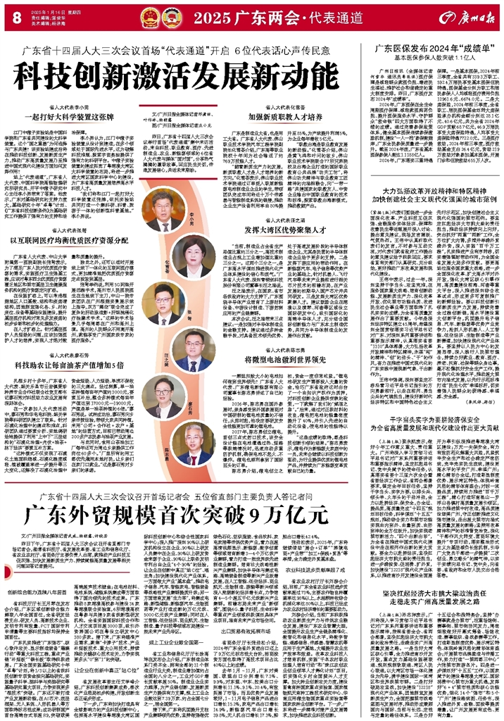 - 科技创新激活发展新动能 文/广州日报全媒体记者邓潇丽、叶作林、杨朝露 图/广州日报全媒体记者庄小龙 昨日,广东省十四届人大三次会议举行首场“代表通道”集中采访活动,来自科技、职业教育、医疗、先进制造业、农业