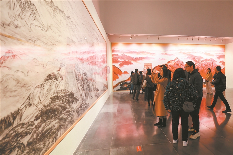 展览分为“缘起·红色地标的恢宏巨作”“设计·主题创作的诗性表达”“落地·艺科融合的生动实践”“创作·时代审美的艺术诠释”四个部分,全面展示《长城颂》的创作历程。从最初的构思萌芽,到实地采风积累素材,再到一笔一画精心绘制,直至最后的精准安装,每一个关键环节都得以呈现。