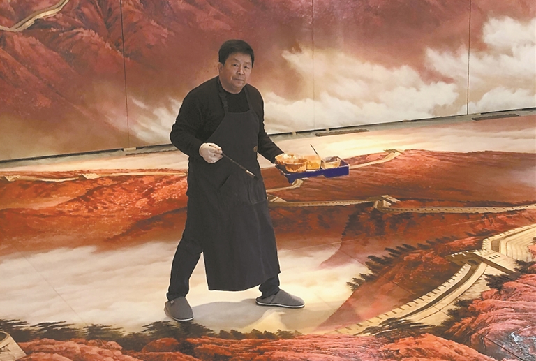 “这幅漆壁画有很多创新的地方。”一方面,这幅作品创新运用中国传统鸟瞰视角,使作品层次分明。近景古松苍翠、烽火台屹立,中远景群山连绵,长城如龙跃峰巅,展现其不朽雄风。山中溪水汇聚成河流,寓意中华民族生生不息,源远流长。红色基调更添辉煌,颂扬中国共产党百年奋斗历程与红色基业的永恒传承。另一方面,《长城颂》总面积600平方米,由100块漆板组成,寓意建党百年。作为漆画史上前所未有的超大体量作品,它在制作、安装方面的难度同样也是前所未有的。传统漆板由木板制成,尺寸误差较大,易变形。为解决这一工艺问题,他大胆构想,通过国内专家技术论证,决定用蜂窝铝板作为壁画胎板,这在国内尚属首创。“蜂窝铝板的优点及安全性远远超出传统手工漆板,板面组合误差小,经测算每块自重在70公斤左右,可以减轻墙体的负荷,解决室内不同高度温差而引起的胎板变形等问题。”