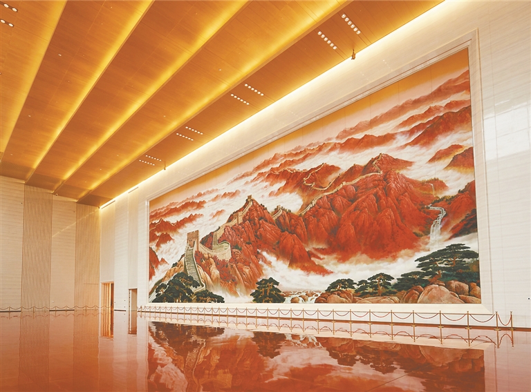 大型漆壁画《长城颂》由清华美院教授程向军牵头创作,历时1年多完成,总面积达600平方米(长40米、高15米)。这幅超大体量的漆壁画作品巧妙融合了中国传统绘画技法和现代艺术理念,生动展现了万里长城的雄浑气势、祖国的壮丽山河、中华民族的精神气度以及伟大建党精神,闪耀着精神之光与艺术之美。这是目前世界上最大的室内漆壁画,荣获中国美术界最具权威性和影响力的国家级奖项——第四届“中国美术奖”评委会特别奖。