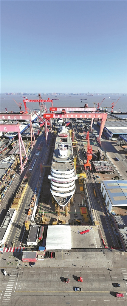 广州日报讯 (全媒体记者耿旭静、董业衡 摄影报道)1月15日,国产大型邮轮爱达·花城号完成了全船结构贯通,接下来将在2025年5月具备坞内起浮的状态,预计于2026年底交付并在广州南沙开启国际航线运营。