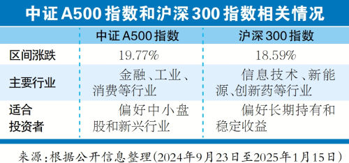 从投资者最关心的收益情况来看,由于中证A500发布于2024年9月23日,从2024年9月23日至2025年1月15日,中证A500和沪深300的区间涨幅分别为19.77%和18.59%。