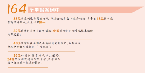 课题组对164个申报案例进行画像分析,发现从改革领域看,38%的案例聚焦营商环境、基层治理和数字政府领域。其中有18%集中在营商环境领域,数量排名第一。这反映了广州“干部作风大转变、营商环境大提升”专项行动成效。据悉,广州去年推动新登记经营主体超60万户、增长11.6%,数量和增速均居全国营商环境创新试点城市首位。华南美国商会报告显示,广州连续7年被列为最受欢迎投资城市。