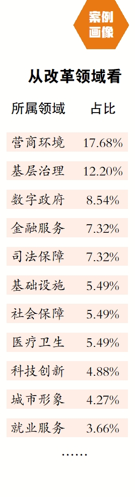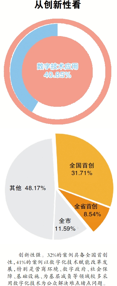 创新性强。32%的案例具备全国首创性,41%的案例以数字化技术赋能改革发展,特别是营商环境、数字政府、社会保障、基础设施、为基层减负等领域较多采用数字化技术为公众解决难点堵点问题。