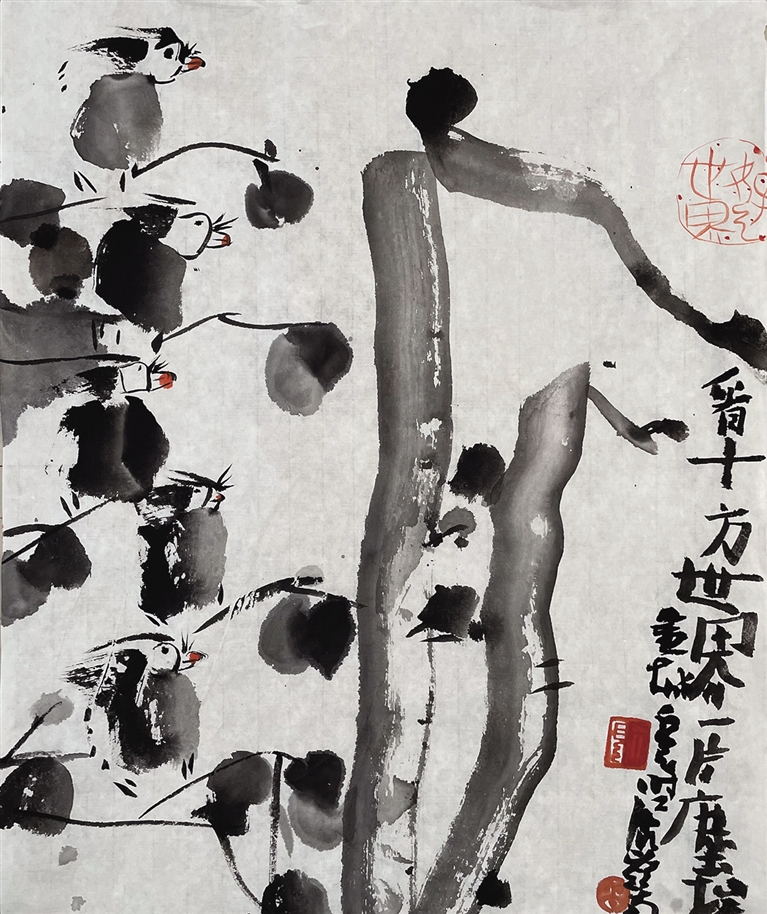 请看:先生的笔墨线条时如玉筋,时如枯柴;时痩硬干燥,拗折突兀,斩钉截铁;时柔软盘丝,牵绕柔韧,千头万绪;时如云朵,松软无骨,绵延轻盈……天真,似信手涂鸦,毫无机心;冷静,则谋篇布局,惜墨如金;挥运笔力若挟风带雨,气势宏大;聚精会神则甲金篆隶,意味深长。论结体、平正奇险皆备,论章法,随机应变齐来……