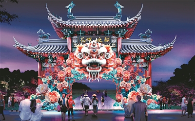 赛博醒狮:天穹式大门将传统舞狮与现代科技、未来主义朋克风格相融合,创造出前所未有的视觉盛宴。
