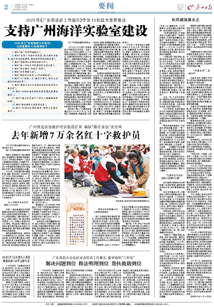 1月18日,2025年《广东省政府工作报告》正式印发。在省十四届人大三次会议期间,22个代表团对省政府工作报告进行了审议,在赞同报告的同时,代表们也提出了一些修改意见和建议。经认真研究核对,共采纳36条意见建议,比较重要的有13处。记者注意到,在部署2025年“加快建设海洋强省”工作时,《广东省政府工作报告》增加了“支持广州海洋实验室、南方海洋实验室、湛江湾实验室建设,推动海洋科技创新发展”,再次提及广州科技研究平台。