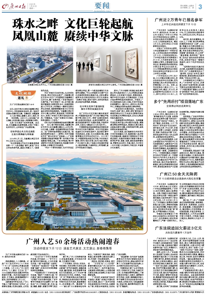 广州市美协、市书协、市民协、市动漫协、市杂协等文艺家协会推出新春广府节庆服装秀、国潮动漫巡游、魔术表演、杂技表演等丰富的文艺志愿活动,为“广州过年”增添浓浓的艺术范、非遗味。“艺起‘杰’作”特展将推出系列惠民活动,带领观众走进华语流行音乐歌手周杰伦的艺术世界,重温青春记忆,共鸣青春心声。最诗意广州——“春之颂”2025新春诗会即将举办,“向美而行”美育讲座、展览配套公益讲座等公教活动全新上线,开启新一年的美育滋养。
