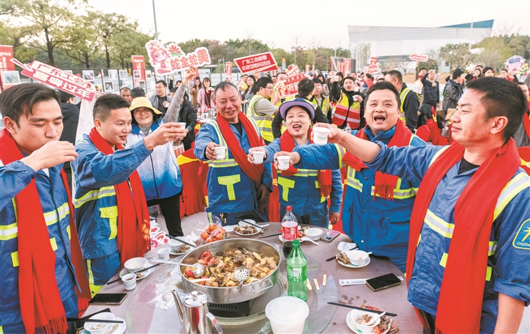 广州日报讯 (全媒体记者邓潇丽 通讯员粤工宣)“祝大家新春大吉”“福气满满”!1月18日晚,在广东省奥林匹克体育中心的第十五届全国运动会主场馆项目工地,350名建筑工人、外卖快递员、网约车司机、环卫工人等一线劳动者代表欢聚一堂,一起吃盆菜宴。