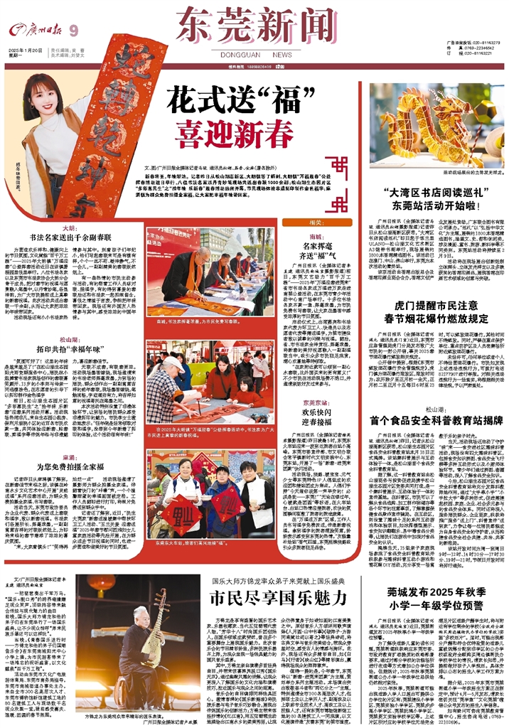 - 花式送“福” 喜迎新春 文、图/广州日报全媒体记者马骏 通讯员松湖、荔香、金麻(署名除外) 新春将至,年味渐浓。记者昨日从松山湖高新区、大朗镇等了解到,大朗镇“万福迎春”公益挥春活动近日举行,八位书法名家以丹青妙笔现