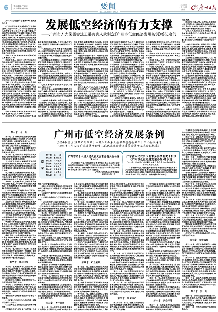 《广州市低空经济发展条例》(以下简称《条例》)已于2024年11月29日经市第十六届人大常委会第三十三次会议表决通过,于2025年1月12日经广东省第十四届人大常委会第十五次会议批准,将于2025年2月28日起施行。《条例》深入贯彻落实党中央关于发展低空经济的重大决策部署和省委、市委工作要求,聚焦空域、基础设施、飞行服务、产业发展、应用场景等关键问题,在法治轨道上为新兴产业发展开辟路径,推动广州低空经济高质量发展。在《条例》公布之际,市人大常委会法工委负责人就制定《条例》的相关问题,回答了广州日报记者的提问。