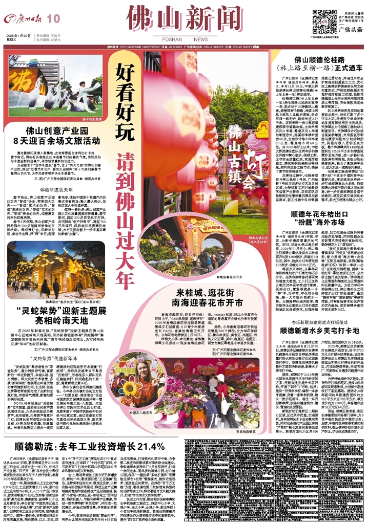 - 好看好玩 请到佛山过大年 佛山创意产业园8天迎百余场文旅活动 舞龙舞狮闪现潮人聚集地,古老挥春街化身网红打卡地……春节临近,佛山街头巷尾处处洋溢着节日的喜庆气氛,传统民俗与非遗在新的语境中,依然焕发着新的创造力。