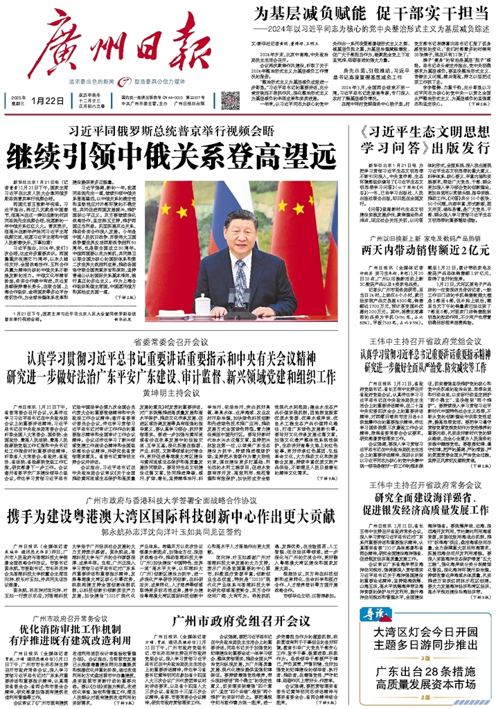 - 认真学习贯彻习近平总书记重要讲话重要指示和中央有关会议精神研究进一步做好法治广东平安广东建设、审计监督、新兴领域党建和组织工作 广州日报讯 1月21日下午,省委常委会召开会议,认真传达学习习近平总书记在中央政治局会议上的重要讲话精神,习近平总书记在中央政治局常委会会议听取全国人大常委会、国务院、全国政协、最高人民法院、最高