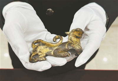 发布会现场展示了广州警方追缴的部分文物。“这两件都是三级文物,分别是春秋时期的青铜镂空剑标和汉代虎形嵌件。”广州市公安局刑警支队二大队教导员李彦介绍,广州警方2024年追缴的文物中有11件经鉴定为三级文物。