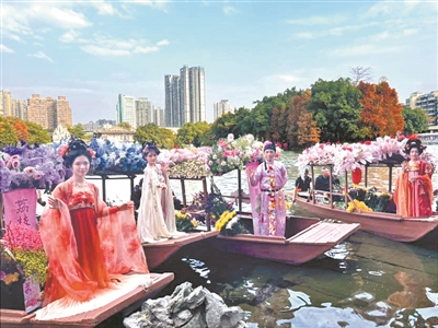 据介绍,本届水上花市在荔湾湖公园打造了以“水”为主的花船巡游,以“陆”为主的花卉装置打卡点以及具有粤剧、西关小姐等文化元素的民俗巡游,通过 “民俗 +”的深度融合方式,旨在让更多人了解广府迎春民俗文化的魅力。
