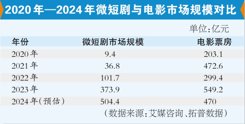 你有多长时间没走进电影院看电影,而是经常在手机上刷微短剧?近日,中国网络视听协会发布的一组数据引发热议,据预估,2024年我国微短剧市场规模将达504.4亿元,同比增长34.90%,而内地电影全年总票房预计为470亿元。预计到2027年,我国微短剧市场规模将超过千亿元。