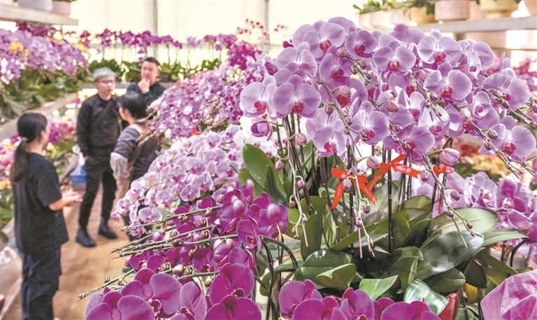 作为华南地区最大、功能最齐全的花卉综合市场,岭南花卉市场全年无休,尤其是每年春节前20天左右,就会开启年宵花批发、零售的高峰期,一直持续至除夕。而今市场上的年橘、蝴蝶兰、大花蕙兰等传统年宵花已经上线,洋溢着新春的氛围。