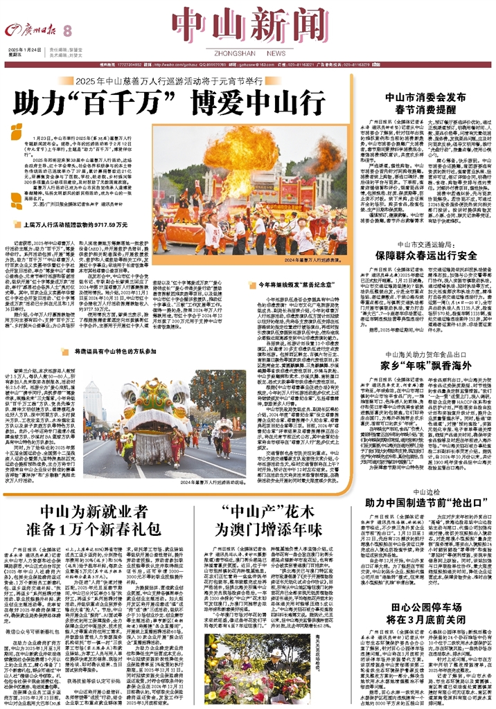 - 助力“百千万” 博爱中山行 1月23日,中山市举行2025年(第38届)慈善万人行专题新闻发布会。据悉,今年的巡游活动将于2月12日(即元宵节)上午举行,主题是“助力‘百千万’,博爱伴你行”。 2025年即将迎来第38届