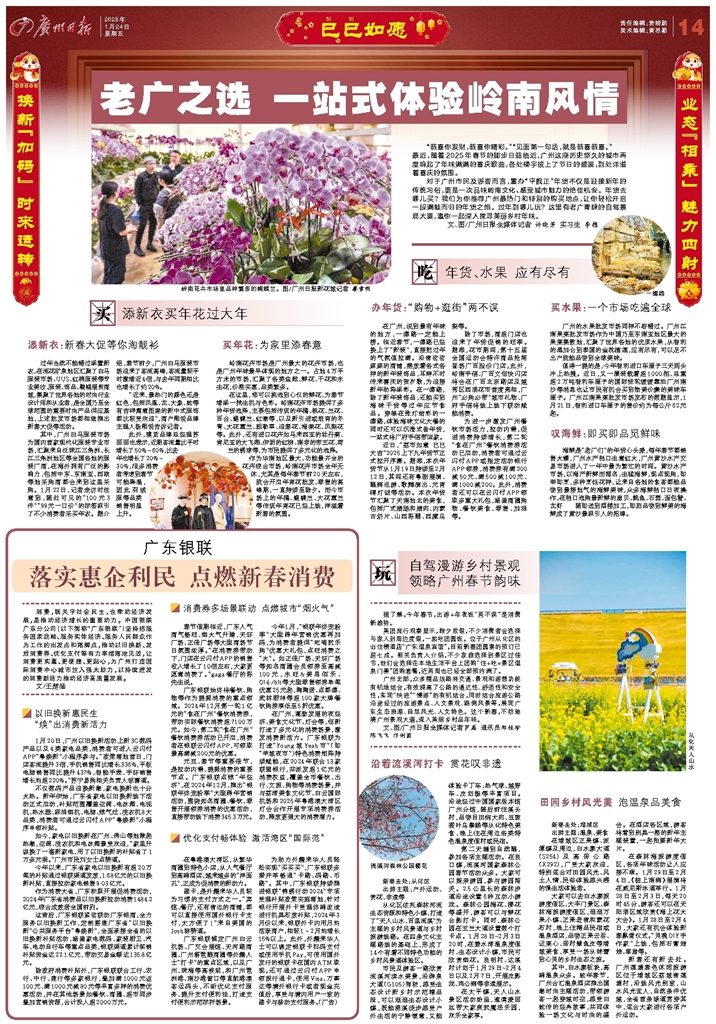 - 老广之选 一站式体验岭南风情 “恭喜你发财,恭喜你精彩。”“见面第一句话,就是恭喜恭喜。”……最近,随着2025年春节的脚步日益临近,广州这座历史悠久的城市再度响起了年味满满的喜庆歌曲,各处楼宇披上了节日的盛装,到处洋溢着喜庆