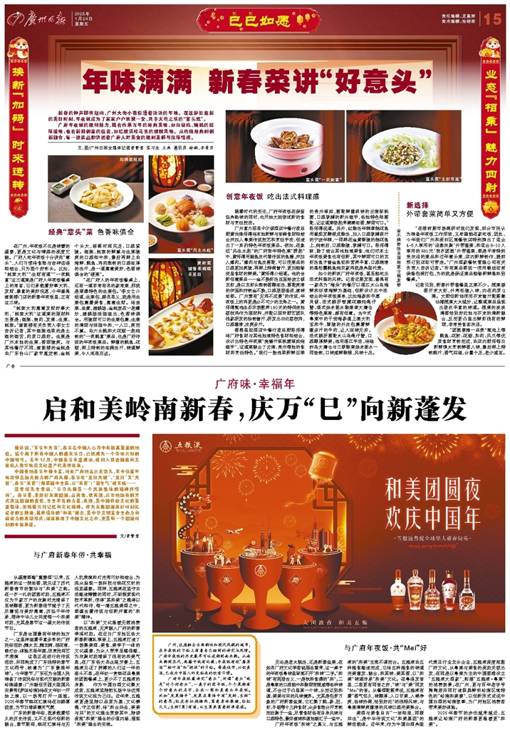 - 年味满满 新春菜讲“好意头” 新春的钟声即将敲响,广州大街小巷弥漫着浓浓的年味。在这辞旧迎新的美好时刻,年夜饭成为了家家户户欢聚一堂、共享天伦之乐的“重头戏”。 广府年夜饭的独特魅力,既有传承百年的经典美味,如白切鸡、烧鹅