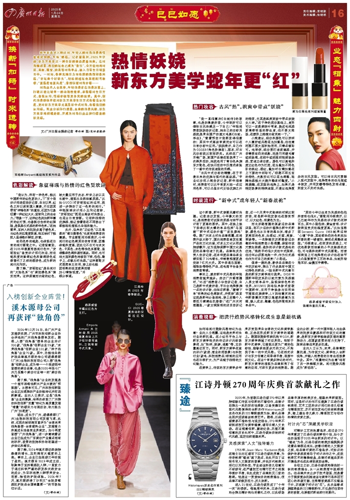 - 热情妖娆新东方美学蛇年更“红” 蛇年新春进入倒计时,年轻人的时尚消费热情也被浓郁的“年味”燃起。记者留意到,2025年伊始,新东方美学以一种全新的姿态席卷而来。在时尚领域里,热烈的红色已成为“索引”,全方位地将时装、美妆、珠宝