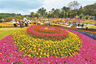 在海心沙亚运公园,“花海”面积达到1.9万平方米,花卉品种包括牵牛花、木春菊花、凤仙花等。在这里市民可以与广州塔合影,喜气洋洋过新年。
