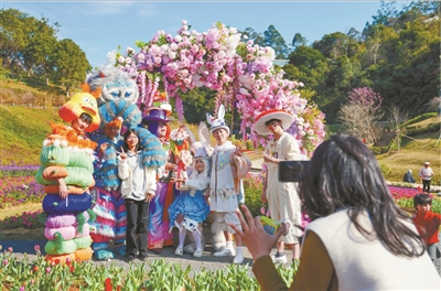 随着春日来临,园区内繁花似锦,郁金香、樱花、油菜花等百花竞相绽放,美不胜收。花埭湾和西西农场是主要赏花地,随便一拍都是大片。大家纷纷在花海秋千等网红装置处打卡,记录美好瞬间。此外,园区内还有热闹的开渔节、童趣的萌宠投喂、璀璨的烟花秀,以及打鼓与许愿墙祈福等丰富多彩的活动。张女士带着家人前来游玩,满心欢喜地说:“春节期间带着孩子来天人山水,真是来对了!花海很漂亮,我们一家拍了好多照片和视频,发朋友圈收到好多点赞!整个园区氛围很好,下次还要再来!”