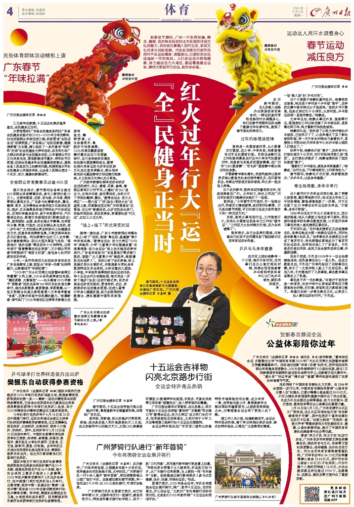 - “全”民健身正当时 红火过年行大“运” 新春佳节期间,广州一片热闹欢腾,舞龙、醒狮、武术等民俗项目让市民感受传统文化的魅力,将传统元素融入现代生活,实现文化传承与创新发展。市民在欢度农历新年的同时不忘运动健身、调整身心,以更好的状态迎接