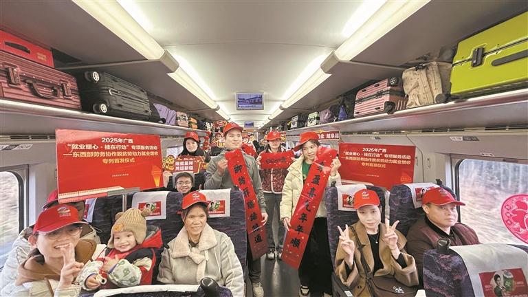 600多名广西籍务工人员搭乘首趟务工人员入粤返岗专列前往广州,开启新一年的务工之旅。