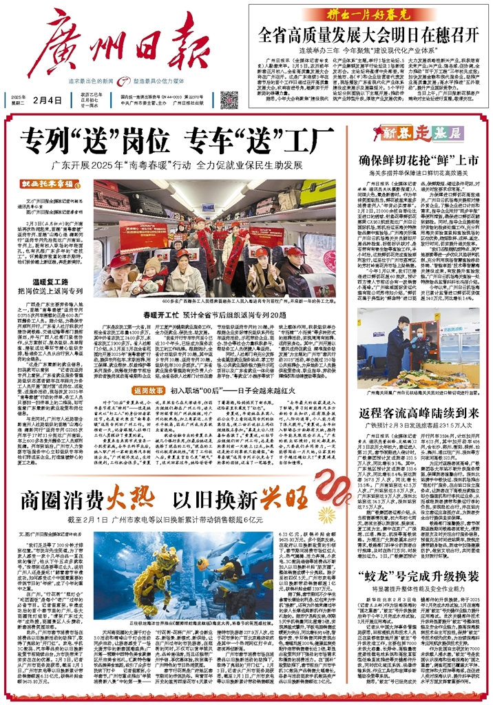 - 专列“送”岗位 专车“送”工厂 文/广州日报全媒体记者何颖思 通讯员粤仁宣 图/广州日报全媒体记者廖雪明 2月3日(正月初六)的广州南站再次热闹起来,首趟“南粤春暖”返岗专列、首趟“山海心连 穗黔同行”返岗专