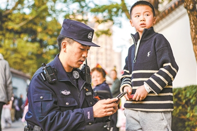 途中出现了一个小插曲。一个男孩站在粤剧艺术博物馆外广场上眼神迷茫、不知所措,谢伟东赶紧跑上前,一问才得知,男孩和他的父母走失了。他一边安抚着,一边询问男孩父母的信息,并带着男孩四处寻找,十余分钟,就和前来寻人的孩子爸爸相遇了。随后,谢伟东继续脚步匆匆往回赶。