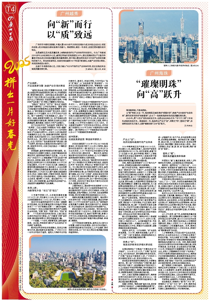 - “璀璨明珠” 向“高”跃升 律回春晖渐,万象始更新。 从“新”突破,过去一年,海珠擦亮区域发展的“破题之钥”,构建产业向新的“生态体系”,谱写招商引资的“崭新篇章”,走出了一条具有海珠特色的高质量发展之路。 2025