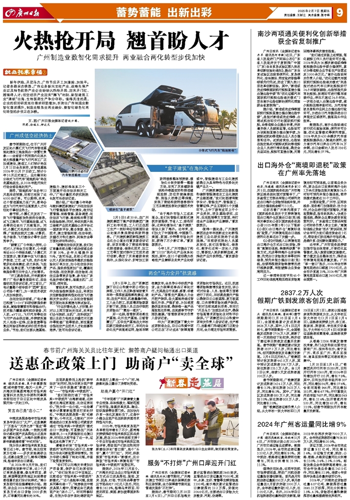 - 火热抢开局 翘首盼人才 新年伊始,开足马力,广州节后开工加速跑、加油干。记者多路采访获悉,广州众多新兴支柱产业、战略先导产业以及特色优势产业企业纷纷火热抢开局、迎来开门红、翘首待人才:低空经济产业迎来“腾飞”时刻、新型