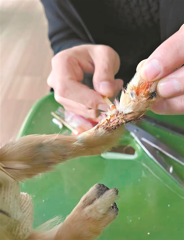随后救助人员进一步为其处理伤口:细致地将缠绕的渔线剪除,用碘伏清理消毒伤口并简单包扎。考虑到它仍需时间恢复身体,工作人员将其暂时安置在宽敞的鸟笼内,喂食面包虫和水,待其伤势好转后再择机放生。