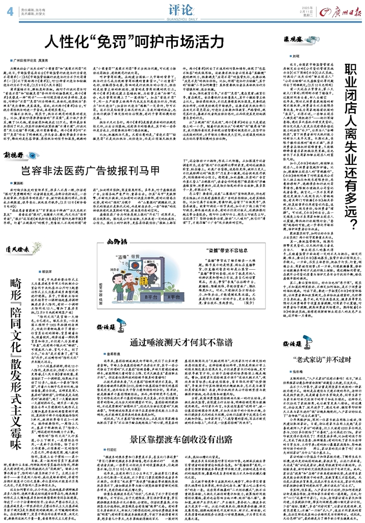 - 人性化“免罚”呵护市场活力 广州日报评论员 庹亚男 为解决社会广泛关注的“小案重罚”和“类案不同罚”问题,近日,市场监管总局出台《市场监管行政违法行为首违不罚清单(一)》及《市场监管轻微行政违法行为不予处罚清单(一)》(
