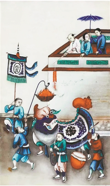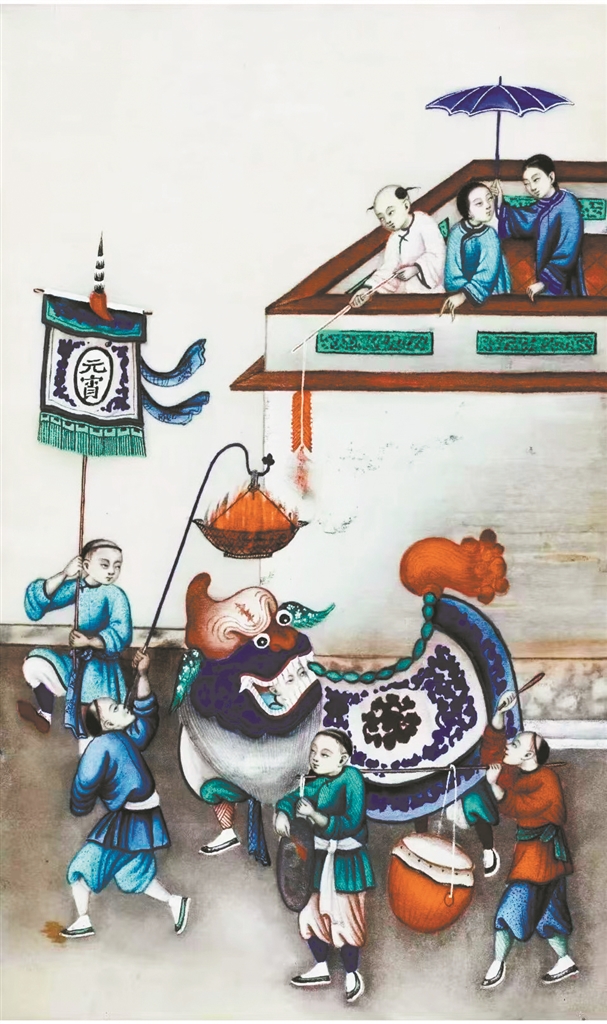 明清时期,岭南的元宵节已是热闹非凡,广府元宵习俗也是多姿多彩:天官赐福、舞狮、舞龙、舞凤、蚌舞、添丁上灯、放烟花……这些习俗有些被描绘在外销画上,沿着海上丝绸之路传播至西方。