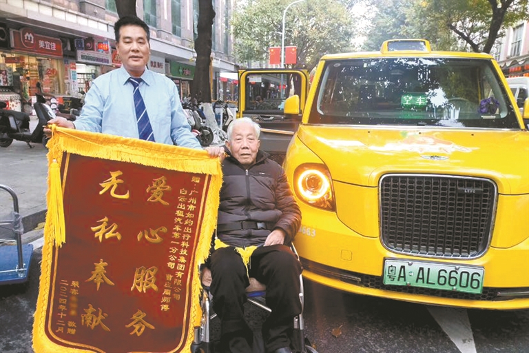2月8日,广州八旬老人吴伯将一面写有“爱心服务、无私奉献”的锦旗,送到如约出行集团无障碍出租车队曹应周师傅手中。