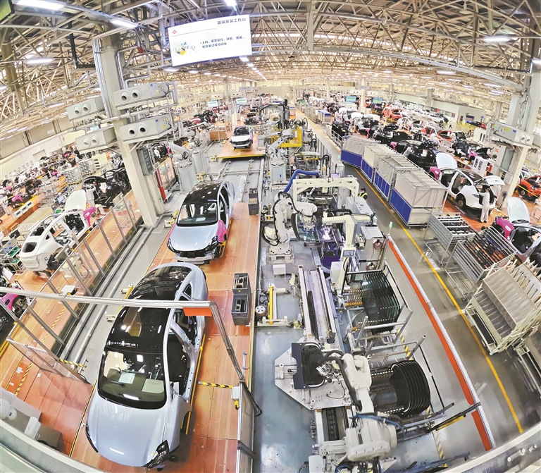 据广汽埃安智能生态工厂第一智造中心总装车间品质技术组组长孙涛介绍,目前工厂的年标准产能是20万辆新能源汽车,“这里的生产节拍是53秒,每53秒就有一辆车从一个工位到下一个工位,这也意味着每53秒就有一辆车下线。”