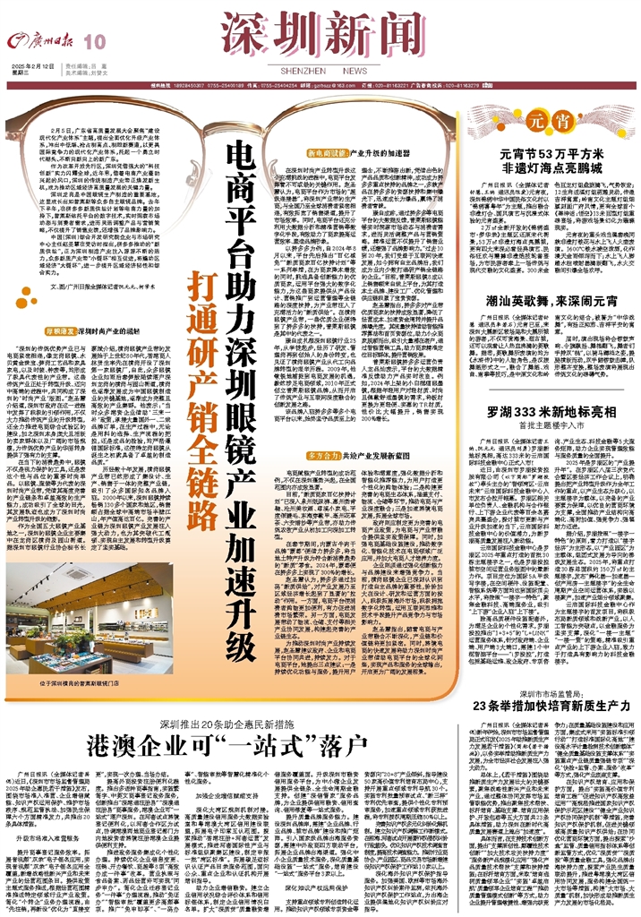 - 打通研产销全链路 电商平台助力深圳眼镜产业加速升级 2月5日,广东省高质量发展大会聚焦“建设现代化产业体系”主题,提出全面优化升级产业体系,冲出中低端、抢占制高点、制胜新赛道,以更具国际竞争力的现代化产业体系,托起一个勇立时代潮头、不断向新向上的新