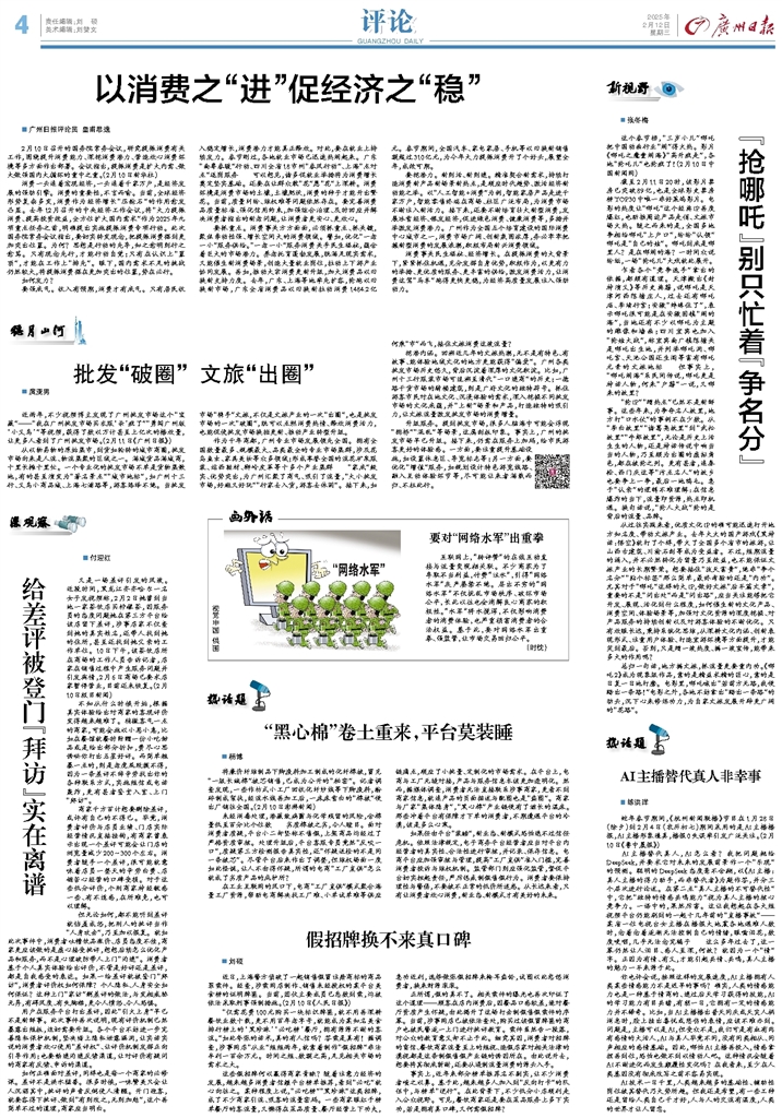 - 以消费之“进”促经济之“稳” 广州日报评论员 皇甫思逸 2月10日召开的国务院常务会议,研究提振消费有关工作,围绕提升消费能力、深挖消费潜力、营造放心消费环境等多方面作出部署。会议指出,提振消费是扩大内需、做大做强国内大循