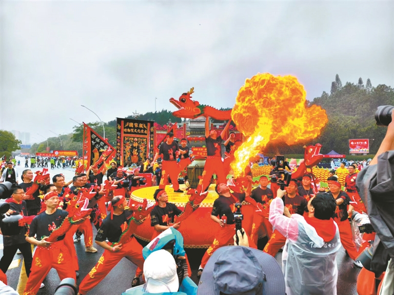 穿插在各方队之间的西区醉龙、古镇六坊云龙、南朗崖口飘色、东区起湾金龙等20多支非遗表演队伍也轮番表演,尽情展现岭南文化、非遗、侨乡文化特色,展示“百千万工程”成果,让广大海内外乡亲感受家乡发展成果、深厚的文化底蕴和向上向善的精神风貌。