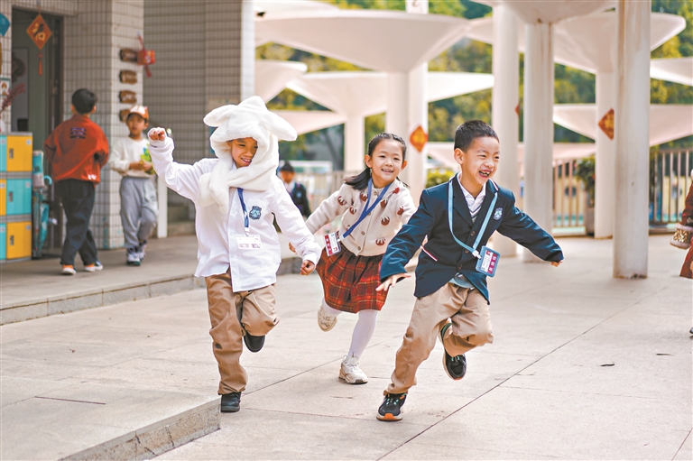 天河区华阳小学上午、下午放学时间各延后5分钟,并优化大课间出操整队时间、优化整合校本课程,从而腾出了“5分钟”。记者在现场看到,课间从10分钟延长为15分钟后,同学们在老师的指导下,组织玩耍“打地鼠”“一二三木头人”等趣味游戏,课间充满欢笑声。一名五年级的男同学说,15分钟是更为充裕的课间。“我们喝完水、做完课前准备之后,还可以眺望远处、放松眼睛。”