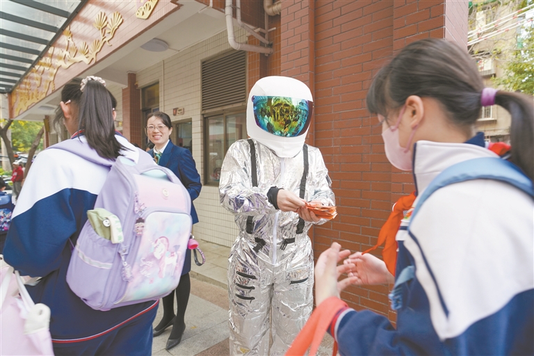 万松园小学校长陈志坚在开学典礼上开讲“思政第一课”。他表示,新时代少年应兼具科技创新能力与文化传承使命。“既要能解码量子计算奥秘,也要守护非遗基因。”
