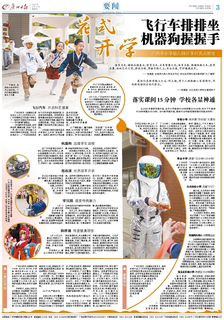 2月13日,广州全市中小学幼儿园迎来了2025年春季学期开学日。各学校为了给学生们一个充满仪式感的开学,准备了各式各样别出心裁的开学活动,让开学首日亮点纷呈。此外,课间15分钟备受关注,广州日报全媒体记者兵分多路,直击各学校开学首日落实情况。