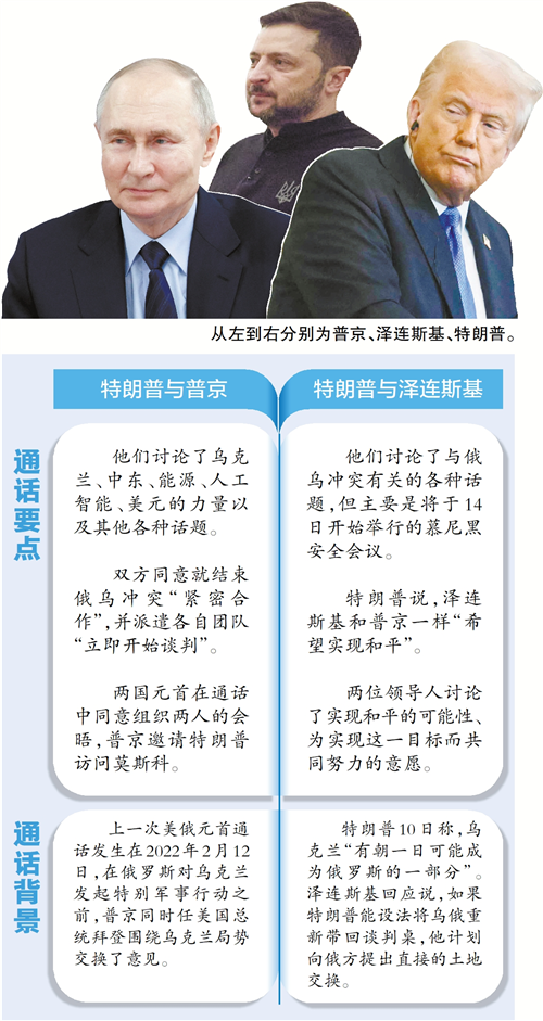 美国总统特朗普12日同俄罗斯总统普京通电话,双方同意“紧密合作”以结束俄乌冲突。当天,特朗普还同乌克兰总统泽连斯基通话讨论乌克兰实现和平的可能性。美国国防部长赫格塞思还表达了不赞成乌克兰加入北约的态度。