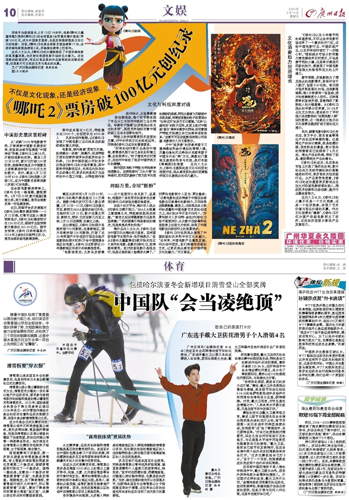 - 《哪吒2》票房破100亿元创纪录 网络平台数据显示,2月13日19时许,电影《哪吒之魔童闹海》(简称《哪吒2》)的全球票房(含预售及海外票房)突破100亿元,成为中国影史首部、也是亚洲首部票房过百亿元的电影!目前,《哪吒2》位居全