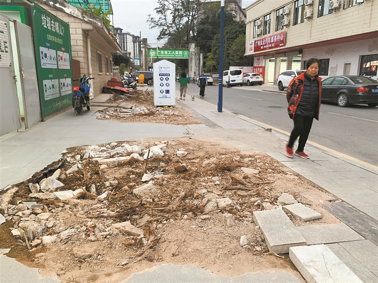 在长江路,道路环境有待治理。这一路段不仅存在人行道地面破损的问题,机动车违停、商铺杂物占道等问题也同样存在。在金洲新村牌坊对面的人行道,可见路面已严重破损,散落着大片泥土和碎砖石、堆积着各种垃圾杂物。令周边居民担心的是,路面破损处没有任何围蔽,行人若不留意,容易被碎石绊倒。此外,在这一路段周边的餐饮店和汽修店外,都有机动车占道乱停在人行道上。