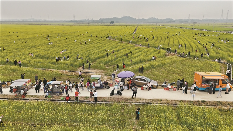广州日报讯 (全媒体记者曹菁摄影报道)日前,清远清新区太和镇举行农文康旅产业高质量发展现场会暨太和镇赏花季活动启动仪式。活动举办地点在太和镇五星村的油菜花田旁,花海间,游客如织,村道旁各种特产目不暇接,摊主们热情地吆喝,与游客的欢声笑语交织在一起,奏响了一曲春日里的乡村热闹交响乐。