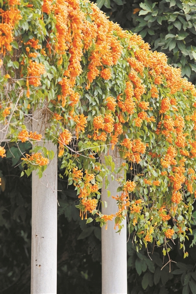 走进东莞人民公园,你一定会被眼前的繁花景象所陶醉。这里的炮仗花宛如瀑布,从凉亭、绿树枝头倾泻而下,热烈的气息扑面而来。